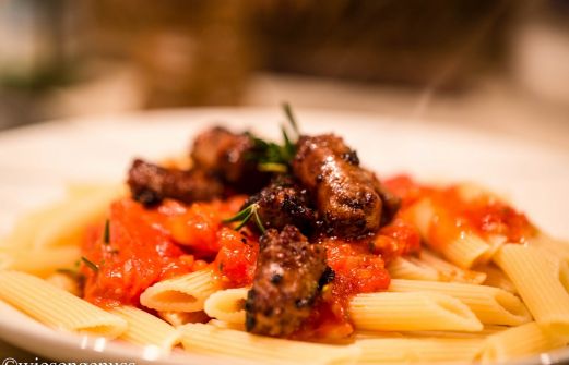 REZEPT für 4 Portionen 250 g Salsicce 250 g Penne 1 Dose Tomatensauce 1 EL Tomatenmark frische Tomaten, grob gewürfelt 2 Schalotten, fein gewürfelt frisch geriebener Parmesan Rosmarinzweige, Thymianblättchen, Meersalz, Pfeffer, Olivenöl und etwas [...]