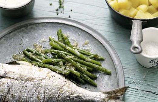 Kräuterdoraden mit Bohnen und Salzkartoffeln Zutaten 4 küchenfertige Doraden (à ca. 200 g, frisch oder TK) Olivenöl Salz Pfeffer 1 Bio-Zitrone 4 Zweige Zitronenthymian 8 Salbeiblätter 3 EL Orangensaft 3 EL Weißwein Küchengarn 1 große Zwiebel 1 kg Bohnen 4 EL Butter [...]