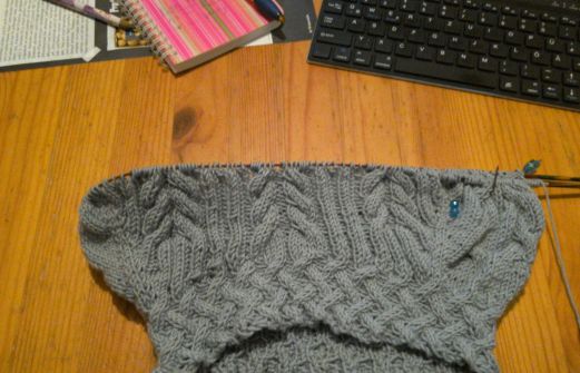 Gestern war ich zu sehr mit stricken beschäftigt, als das ich Zeit für einen kleinen Zwischenbericht hatte. Am Ende des Kragens habe ich in den Einteilungsrunden die Verzopfung übersehen. Aber das fällt nicht weiter ins Gewicht (hoffe ich) Vorderteil mit richtiger Verzopfung D [...]