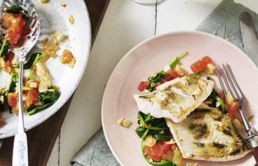 Zander mit Mandelspinat Zutaten 4 dicke Zanderfilets mit Haut (Loins, je 200 g) Salz Pfeffer Saft von 1 Zitrone 2 EL Mandelblättchen 500 g Blattspinat 1 kleine Zwiebel 1 Knoblauchzehe 2 kleine Tomaten 3 EL Olivenöl 1 EL Butter 4 dünne Scheiben durchwachsener Räuchersp [...]