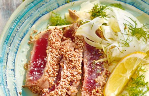 Thunfisch auf Fenchelsalat Zutaten 2 Knollen Fenchel 9 EL Olivenöl frisch gepresster Saft von 1 Zitrone Fleur de Sel Pfeffer aus der Mühle 1 Stück Parmesan (ca. 50 g) 50 g Sesamsamen 2 EL Sonnenblumenöl 4 Scheiben sehr frischer Thunfisch (Sushi-Qualität) Anzahl Portio [...]