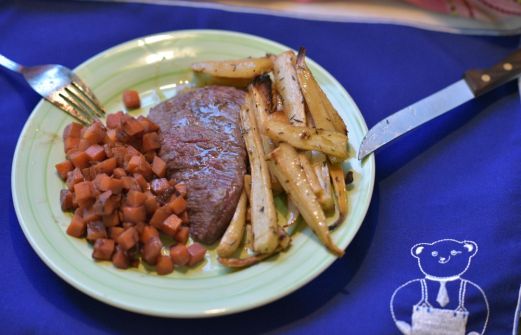 Wie Steakbraten geht, wisst Ihr, oder? Das Rezept für die marokkanischen Karotten auf dem Foto wird nachgeliefert, das für die gebackenen Pastinaken in Honig steht unter dem Bild. Danke Dietmar !