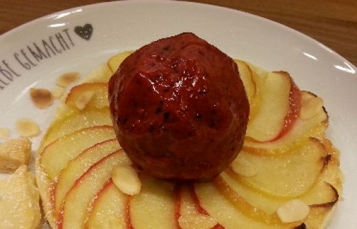 Apfel-Tarte mit Beeren-Joghurt-Eis Zutaten 150 g Blätterteig 1 - 2 Äpfel (Elstar) etwas Zitronensaft 30 g Butter 2 EL Honig 200 g gemischte Beeren (TK oder frisch) 150 g Joghurt (Natur o. Frucht) 75 g Zucker Kirschlikör nach Belieben Puderzucker, Mandelblättchen Anzahl Por [...]