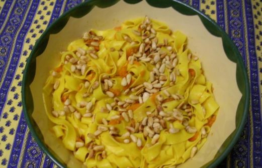 man nehme... 250 g Tagliatelle 400 g Kürbisfleisch, geschält und in Würfel geschnitten 2 TL Curry 8 EL Sahne 4 EL Pinienkerne oder Sesam Salz Pfeffer Kürbis in Salzwasser gar kochen, abgießen und mit einer Gabel zerdrücken. Sahne und Curry dazugeben, salzen und pfeffe [...]