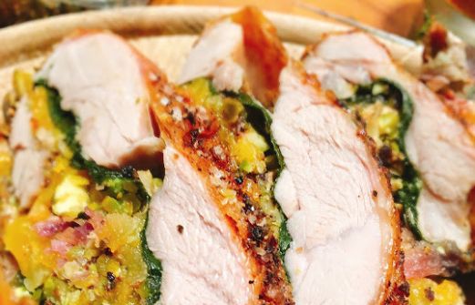 Die Milchlammkeule habe ich mir von meinem Metzger entbeinen und flach klopfen lassen. Diese wird jetzt vorsichtig gesalzen und mit jungem Spinat belegt. Jetzt folgen gehackte Pistazien und gewürfelte, getrocknete Aprikosen, rote Zwiebeln (in Ringe geschnitten) und Knoblauch. Gewürzt wird mit K [...]