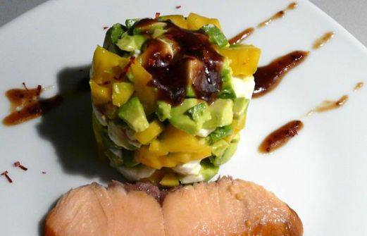 Geräucherter Lachs Büffelmozzarella, Avocado, Mangosalat an altem Balsamico