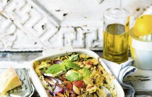 Quinoa-Auflauf mit Ricotta Zutaten 150 g Quinoa Salz Salz 400 g schmale, längliche Zucchini 2 kleine rote Zwiebeln 3 Zweige Rosmarin 350 g Cocktailtomaten 1 Knoblauchzehe 4 EL Olivenöl Pfeffer 150 g Mini-Mozzarellakugeln 60 g Parmesan (am Stück) 1 Bio-Zitrone 250 g R [...]