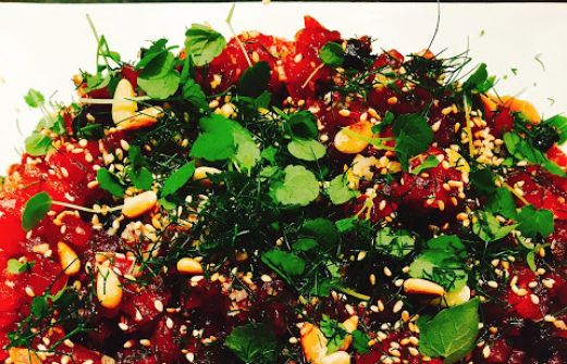 Marinade aus Sojasauce, Miso, Mirin, Sake, Reisessig, braunem Zucker, Knoblauch, Nori- Algen und Sesamöl anrühren. Besten Thunfisch (in Sushiqualität) mit dem Messer (Chai Dao) in kleinste Würfel schneiden und in der Mariande baden. Mit Algensalz und Pfeffer würzen und mit geröstetem Sesam, Pin [...]