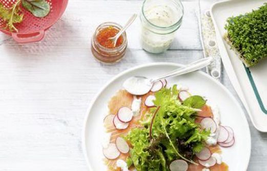 Lachs-Carpaccio Zutaten 50 g saure Sahne ½ EL Limettensaft 1 TL körniger Senf 1 TL Kapern Salz Pfeffer 6 Radieschen 50 g Blattsalat-Mix (küchenfertig und gewaschen) ½ EL Rotweinessig ½ EL Öl (z. B. Rapsöl) 4 Scheiben Räucherlachs 2 TL Lachs- oder Forellenkaviar ½ Beet [...]