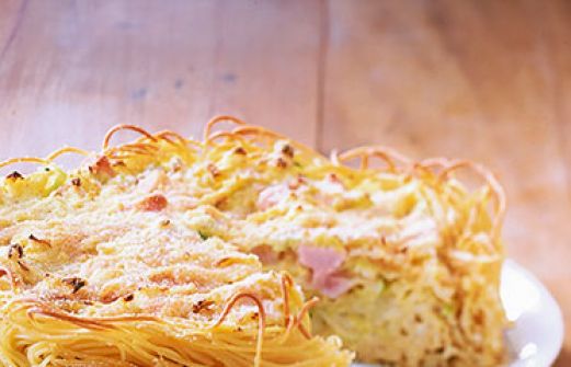 Spaghetti-Torte Zutaten 400 g Spaghetti Salz 500 g Wirsing 4 EL Butter 30 g Mehl 300 g Sahne schwarzer Pfeffer 1 Prise frisch geriebene Muskatnuss 300 g geräucherte Putenbrust am Stück 4 Eier 3 EL Paniermehl Fett für die Form Anzahl Portionen: 12 Stücke Zubereitu [...]