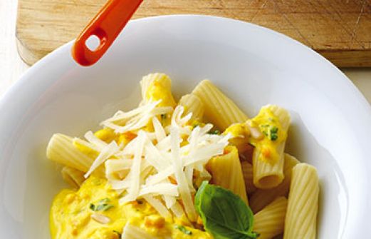 Rigatoni mit Möhrensauce Zutaten 250 g Möhren 1 EL Olivenöl extra nativ 150 ml Gemüsebrühe 200 g Rigatoni (dicke Röhrennudeln) Salz 1 EL Marsala (ersatzweise Sherry Medium) 2 EL Sahne 1 EL Pinienkerne 1 EL fein geschnittene Basilikumblätter Pfeffer 1 TL Zitronensaft 35 g [...]