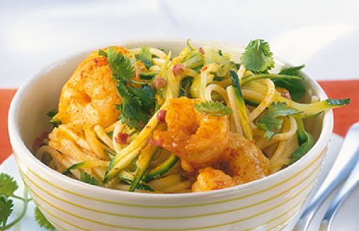 Zucchini-Spaghetti mit Garnelen Zutaten 4 Knoblauchzehen 1 Stück frischer Ingwer (ca. 2 cm) 400 g rohe ungeschälte Garnelenschwänze 8 EL Olivenöl Salz rosa Pfeffer, gemahlen 1 TL gemahlene Kurkuma 1 TL milde Sojasauce 400 g Zucchini 400 g Spaghetti 1 EL gehacktes Koriandergrü [...]