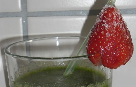 Wildkräuter und güner Salat 1 Apfel 2 Erdbeeren etwas Möhrensaft Wasser