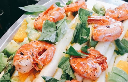 Inspiriert durch ein Rezept in der aktuellen E&T (05/16). Leichte, frische Aromen (Orangensaft- und Zesten, Ingwer, Vanille, weisse Zwiebeln, Mandelöl und Koriander) für die Marinade in der der gegarte Spargel noch eine halbe Stunde badet. Dazu in Knoblauch und Chili gebratene Gambónes.