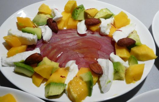 Variante 1 Variante 2 Für 2 Personen: 2 Scheiben geräucherter Thunfisch 100 g Büffelmozzarella ½ Avocado ½ Mango feine Chilistreifen Olivenöl Pinienkerne, geröstet
