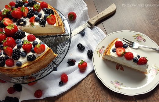 Mitgebracht habe ich euch jedenfalls auch eine Kleinigkeit, nämlich einen American Cheesecake mit vielen, vielen Beeren.
