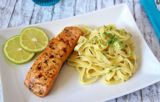 2 Stücke Lachs | Salz | Pfeffer | roter Pfeffer | 1 EL Zitronensaft | Olivenöl | 2 Zitronen | 400 g Tagliatelle | Kresse