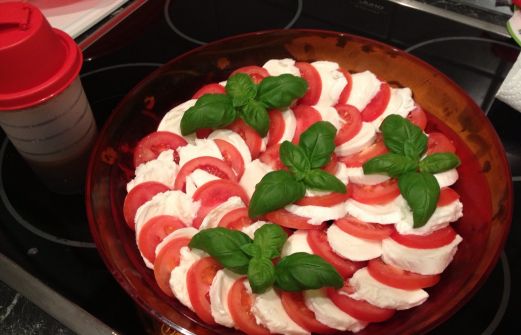 Die Tomaten und die Mozzarella-Kugeln in Scheiben schneiden (nicht zu dünn!). [...]
