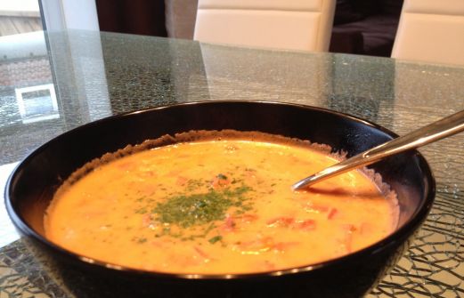 Zutaten für 2 Portionen: 350g Garnelen 4 Rispentomaten 1 EL Suppengrundstock 200ml Kokosmilch frisch gemahlener Pfeffer Extra Petersilie Rezept: Die Garnelen mit etwas Wasser ca. 5 Minuten in einer Pfanne andünsten. Die Tomaten klitzeklein schneiden und hinzufügen. Tomaten-Garnele [...]