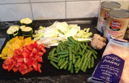 Zutaten für 4 Portionen: 500g Pacific Prawns 400ml Kokosmilch 1 Ingwerknolle 1 große Zucchini 2 Parika (gelb und rot) 1 Lauch 250g Böhnchen Sojasoße, Rapsöl, grüne Chinapaste 200g Mie-Nudeln Rezept: Zunächst das Gemüse (Ingwer schälen und in hauchdünne Streifen schneiden) klein [...]