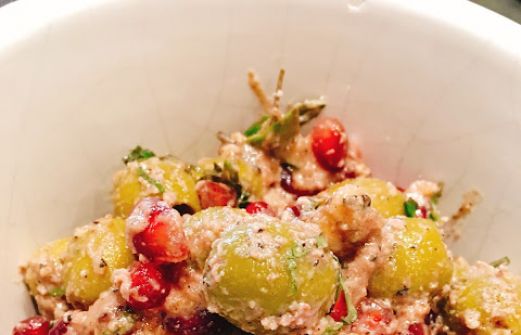 Grüne Oliven, mariniert mit bestem Olivenöl, gemahlenen Walnüssen, getrockneter Minze, Knoblauch, Basilikum, Granatapfelmelasse, Salz und Pfeffer. Granatapfelkerne dazu geben und als Snack servieren
