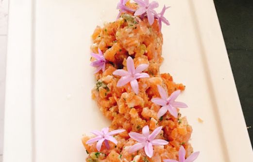 Frischer- und geräucherter Lachs in feine Würfel geschnitten, Sauce Tatar, Olivenöl, Schalotten, Kapern, Schnittlauch, einige Tropfen Limonensaft, Salz, Pfeffer und Knoblauchblüten. (pic und Idee: R.Pakzad)