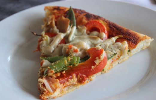 Die zweite Pizza haben wir mit Zucchini, Paprika und Chicken-free Chunks belegt. Letzteres gibt es u.a. bei alles-vegetarisch.de. Wir haben sie bei Rewe entdeckt.