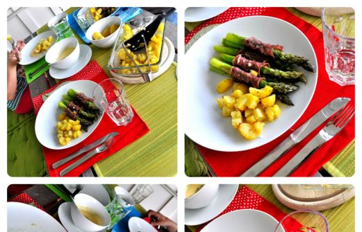 ...jetzt bitte mal die Küche auf? ...and now... who is going to clean the kitchen ? Grüner Spargel in Bresaola auf Knoblauch-Olivenpaste und Kartoffeln mit Parmesan gratiniert