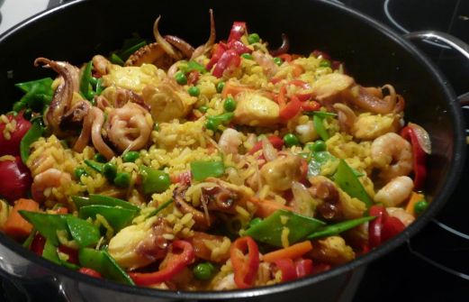 Riesengarnelen Shrimps Pulpo Herzmuscheln u.a.m. (Meeresfrüchte und Fisch nach Geschmack und Verzehrmenge) 500 ml Fischfond, selbstgemacht oder Fischfonds aus dem Glas 500 ml Gemüsebrühe 4 geschälte, enthäutete Tomaten Erbsen Zuckerschoten Paprika Safran Salz, Pfeffer Thymian 50-60 [...]