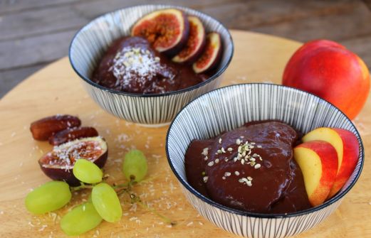 Zutaten: 1 reife Avocado 2 Bananen 4 EL Kakao,ungesüßt 1 El Nußmuss Die Avocado von Schale und Kern befreien, sowie die Bananen schälen. Alle Zutaten in einen Mixer geben, geht auch wunderbar mit einem Handmixer, und alles fein pürieren. Mit Lieblingsfrüchten toppen.