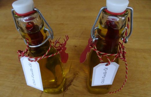 Zutaten: 6 getrocknete Chilischoten + 1 weitere für die Flaschendeko (für später) 0,5 l Olivenöl 1 TL Vanillemark oder 1 Vanilleschote (ausgekratzt) Zubereitung: Die Chileschoten fein hacken (Vorsicht! Bitte Handschuhe anziehen, denn sonst brennt das [...]