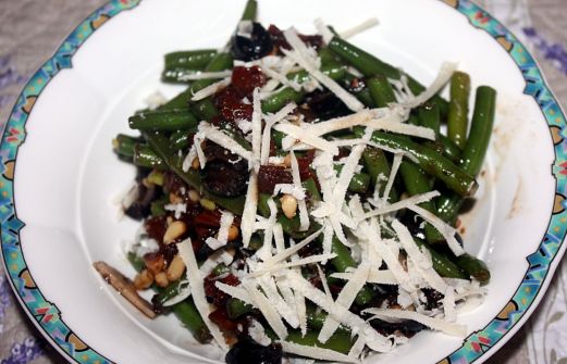 Zutaten: 200g Bohnen 6 getrocknete Tomaten in Öl eingelegt 80g schwarze Oliven 1 EL Aceto Balsamico 3 EL geriebener Parmesan 2 EL Pinienkerne Salz, Pfeffer Oregano Zubereitung: Die frischen Bohnen ca. 5 min kochen und danach abkühlen lassen. Die Pinienkerne in einer Pfanne anrösten [...]