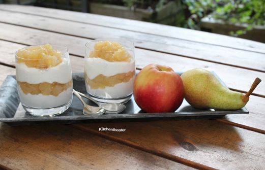 Die Apfel-Birnen-Grütze am besten einen Tag zuvor kochen. Nun braucht man am Tag des servieren nur noch den Quark und die Sahne verrühren und in die Gläser schichten. Schon ist alles fertig.