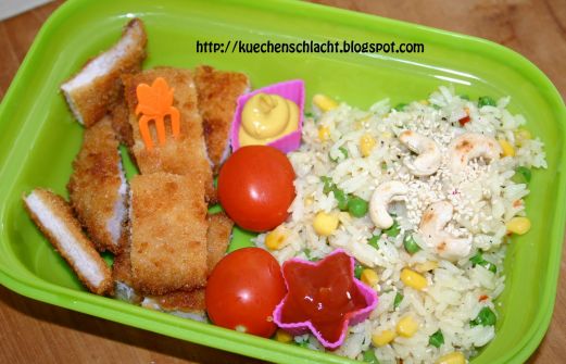 Heute mal ein schnelles Bento, welches ich für meine Kolleginnen in der Mittagspause gemacht habe. Es musste schnell gehen, daher ist es etwas einfacher. Schnitzelstücke, Tomaten, Gebratener Reis mit Erbsen und Mais, darauf geröstete Cashewkerne und Sesam. Dazu gab es dann noch eine Senfraute u [...]