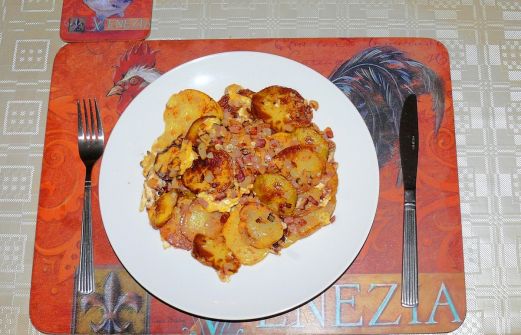 Mein Rezept! Bauernfrühstück Zutaten: 4 große Pellkartoffeln, 200 g geräucherten, durchwachsenen Speck 1 große Zwiebel, 2 bis 4 Eier, Salz und Pfeffer aus der Mühle Zubereitung: Den durchwachsenen Speck in kleine Würfel schneiden und beiseite legen. Das gleiche machen wir mi [...]