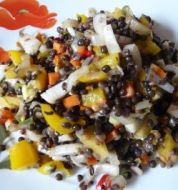 Es würde zu dem Salat als Beilage auch vieles Anderes passen. Von angebratener Chorizo bis zu geräuchertem Fisch. Ich hatte mich für gebratenen Fisch entscheiden. Der kalte Salat ist schön würzig und der warme Fisch passt gut dazu, für 2 Portionen