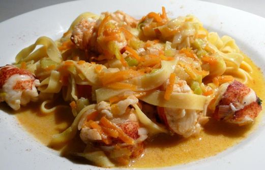 200 g Linguine Salz Basilikum Knoblauchzehe 1 rote Chilischote 400 g Hummerfleisch 2 EL Olivenöl Noilly Prat 50 ml trockener Weißwein 50 ml Schlagsahne Pfeffer aus der Mühle 75 g frische gehobelter Parmesan Die Linguine in kochendem Salzwasser al dente garen. Das Basilikum waschen [...]