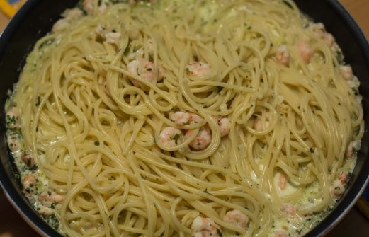 Zutaten: 500g Spaghetti 500g Garnelen 1 Zwiebel 3 Knoblauchzehen 2 Chilischoten 2 EL Öl 1 Zitrone 160 ml Gemüsebrühe 200 ml Sahne 1 Bund Petersilie, 250 ml Weißwein Zubereitung: Die Zwiebel und den Knoblauch in kleine Würfel schneiden, die Petersilie hacken. Die Chilischoten hal [...]