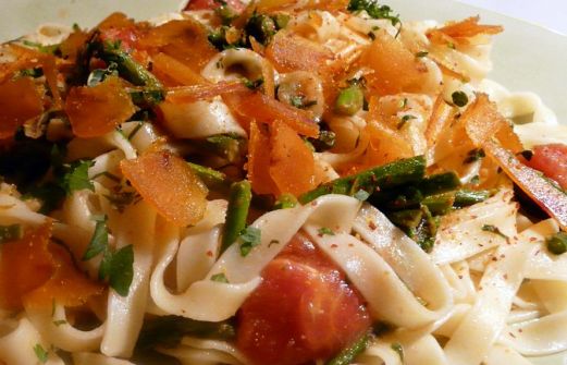 1 Knoblauchzehe 1 Bund Petersilie, glatt 1 Chilischote 60 g Rogen (Bottarga) 220 g Spaghetti viel Olivenöl Den Knoblauch pellen und in feine Scheiben schneiden. Die Petersilienblätter von den Stielen zupfen und hacken. Chilischote entkernen und fein hacken. Den Bottarga häuten u [...]