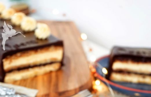 Zutaten: Jaconde: 3 Eiweiß 50 g Zucker Prise Salz 3 Eier 35 g Zucker 110 g Mandeln, gemahlen 35 g Mehl 25g Butter, flüssig Tränke: 30 g Zucker 30 g Wasser 80 ml Kaffee, stark Füllung 1: 300 g Schokolade, zartbitter 150 g Sahne Füllung 2: 100 g Eigelb, c [...]