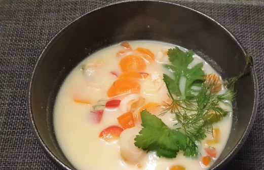 Zutaten für 2 Personen 2 Stängel Zitronengras 1/2 Limette 10 g Ingwer, frisch 1 Bund Koriandergrün, frisch 1 Knoblauchzehe 2 Chilischote 2 kleine Pastinaken 1 Möhre 1/2 rote Paprika 200 ml Gemüsebrühe 200 ml Kokosmilch, Dose 2 EL Fischsauce, asiatisch 2 EL Agavendicksaft 200 g Garnelen a [...]