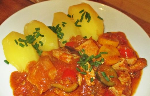 Schnelles leichtes Essen für warme Tage Für 3 Personen 800 GR Hähnchenbrustfilet 2 Zwiebeln gehackt 1 Knoblauchzehe gehackt Salz Pfeffer schwarz fisch gemahlen Etwas Cayennepfeffer 1 EL Butter 400 GR TK-Gemüse mit Auberginen, gelber u. grüner Zucchini sowie roter Paprika 1 TL Basilikum getrockn [...]