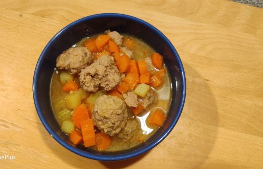 Zutaten 1 kg Möhre(n) 300 g Kartoffel(n) 300 g Sellerie 2 Zwiebel(n) 2 EL Butter 1 ½ Liter Fleischbrühe, Instant Salz und Pfeffer 300 g Gehacktes, halb und halb 1 kleine Zwiebel(n) 1 kleine Knoblauchzehe(n) 2 EL Paniermehl 1 Ei(er) Paprikapulver, edelsüß 1 EL Petersilie, gehackt 1 EL Schni [...]