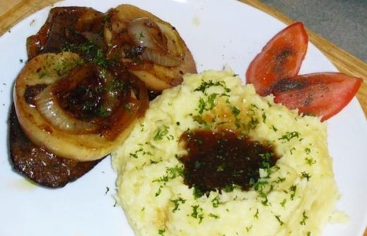 Nach alter Berliner Art mit Kartoffelpüree Für 4 Personen Die Leber Rinderleber 4 Scheiben Zwiebeln frisch in Ringe geschnitten 3 Stück Äpfel in Ringe geschnitten 3 Stück [...]