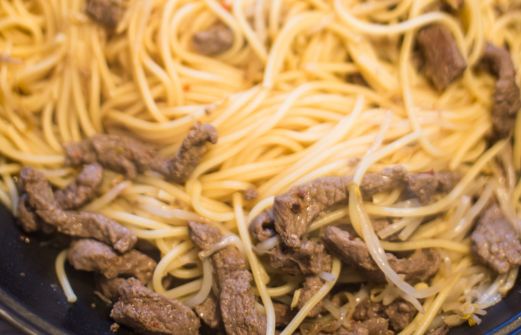 Zutaten: 500g Spaghetti 3 EL Erdnussöl 1 Zwiebel 1 Knoblauchzehe frischer Ingwer Chilipulver 400g mageres Rindfleisch 2 EL Sojasauce etwas Sesamöl 160g Sojasprossen Zubereitung: Die Spaghetti nach Herstellerangaben zubereiten. Erdnussöl in einem Wok erhitzen und die in Ringe geschnittene Zwiebe [...]