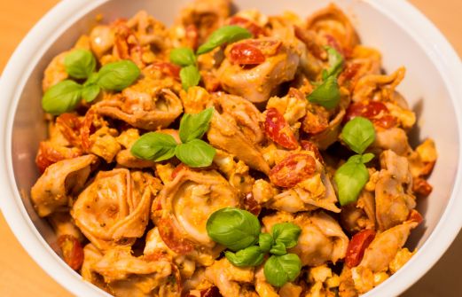 Zutaten: 2 Pakete Tortellini (ohne Fleischfüllung) 1 Glas rotes Pesto 2 Kugeln Mozzarella 250g Cocktailtomaten Basilikum Zubereitung: Tortellini kochen, abschütten und rotes Pesto untermischen. Tomaten halbieren, Mozzarella würfeln und zu den Tortellini geben. Darüber Basilikum streuen.