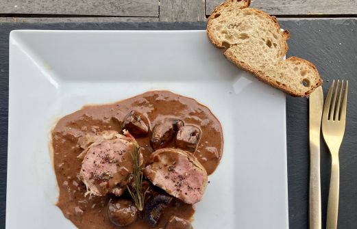 Schweinefilet im Speckmantel Es wird Schweinefilet das im Speckmantel einwickelt ist und in einer Champignons Sahne Sauce serviert wird. Das Gericht kann man recht schnell zubereiten oder man versucht einen optimalen Geschmack zu erreichten dann dauert es allerdings länger. [...]