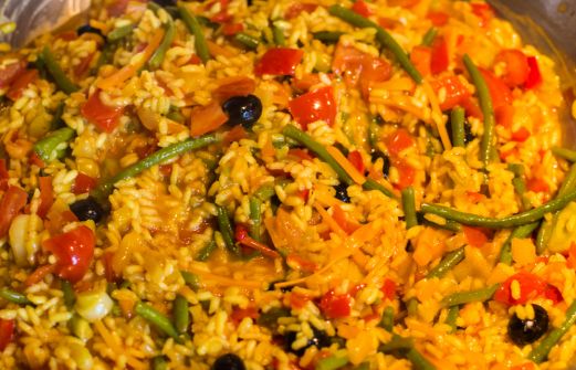 Zutaten: 400g Paellareis 6 EL Olivenöl 800ml Gemüsebrühe 1 TL Kurkuma 1 Lorbeerblatt 3 Paprikaschoten rot und grün 4 Tomaten 1 Zwiebeln 5 Knoblauchzehen 200g Bohnen, grüne 1 Stange Lauch 2-3 Möhren 100g Oliven 1 EL Paprikapulver, edelsüß Salz und Pfeffer Gemüsebrühe, nach Bedarf Zubereitung: In [...]