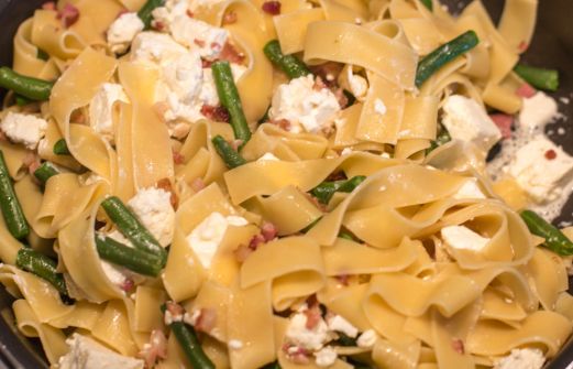 Zutaten: 400g grüne Bohnen 1 Pck. Schafskäse 150g Schinken, Bacon oder Speck 300g Bandnudeln Salz und Pfeffer Zubereitung: Die Bohnen in Salzwasser gar kochen. Den Schafskäse würfeln. Den Schinken in Würfel schneiden und in einer Pfanne knusprig braten. Die Bandnudeln in Salzwasser bissfest koc [...]