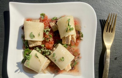Es ist eine Pasta mit kaltem Tomaten und Thunfisch, genau das richtige für